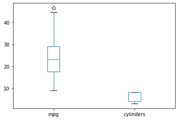 df[['mpg', 'cylinders']].plot(kind='box')