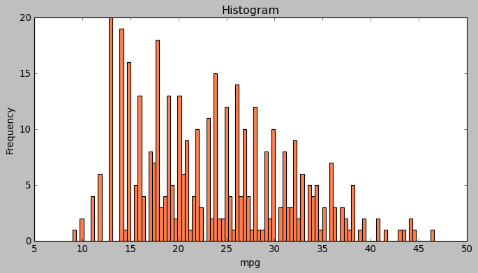 df['mpg'].plot(kind='hist', bins=100, color='coral', figsize = (10,5))