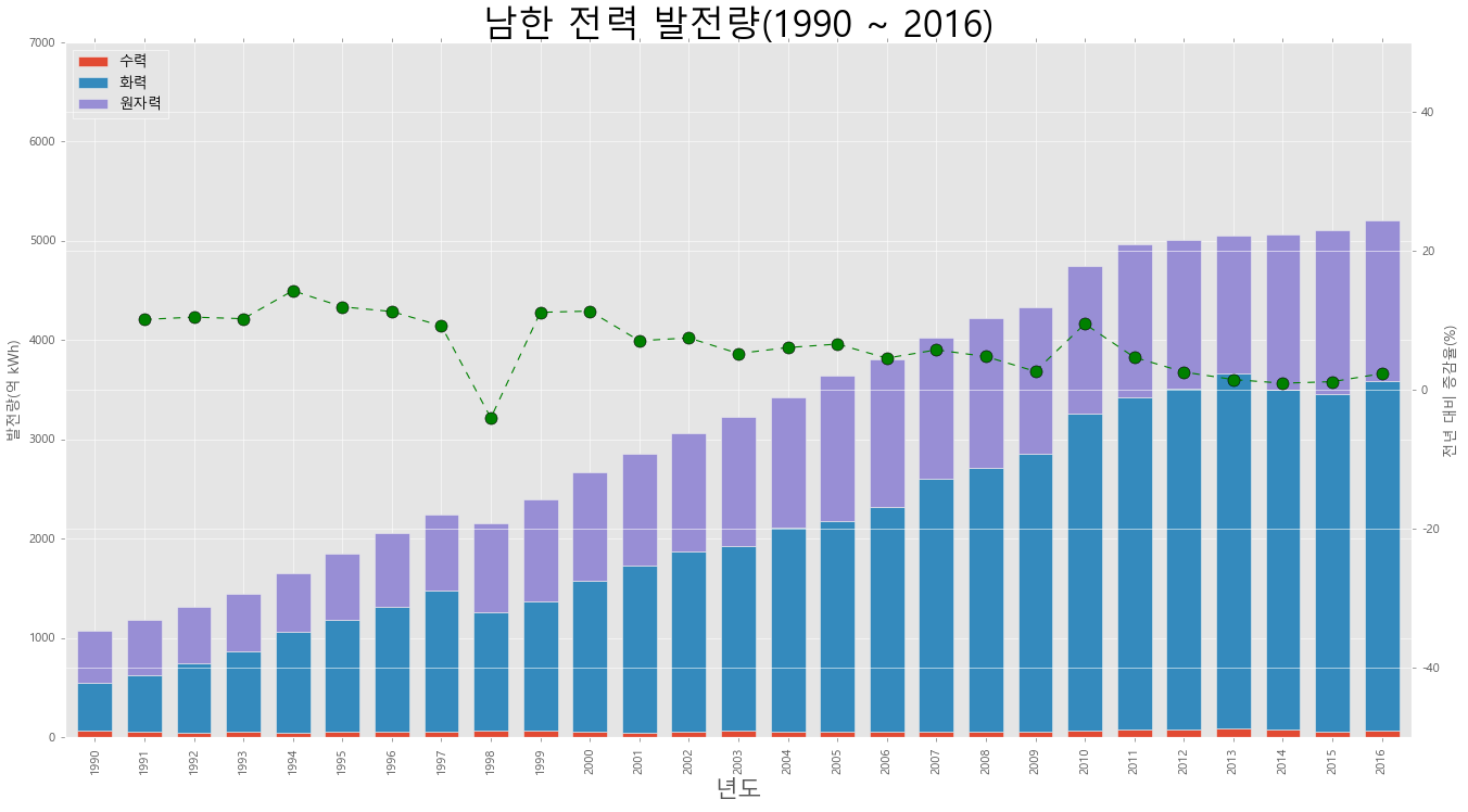 plt.title('남한 전력 발전량(1990 ~ 2016)', size= 30)