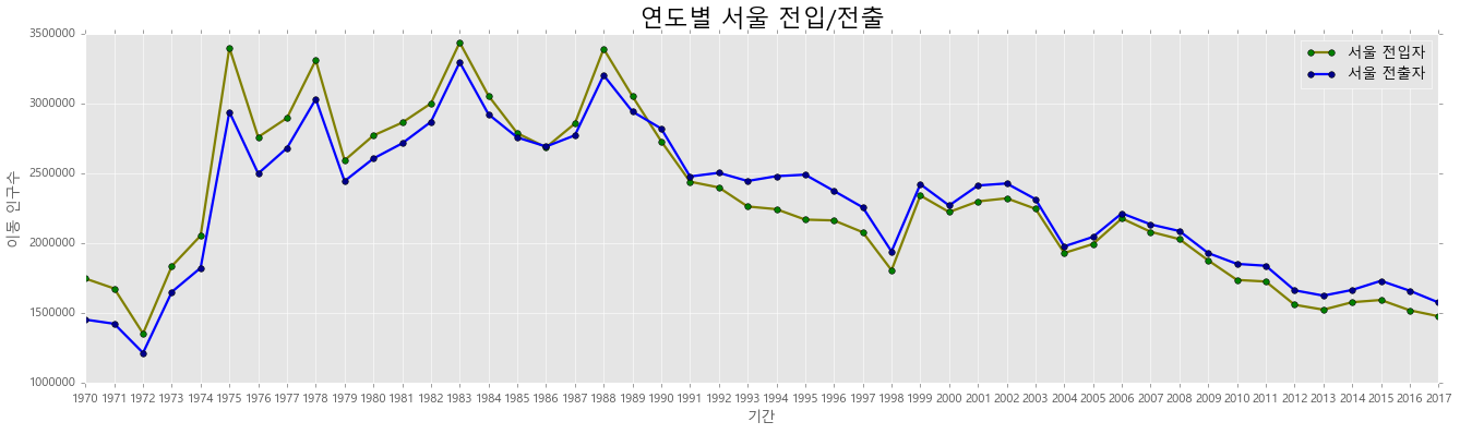 ax.set_title('연도별 서울 전입/전출',size = 20)