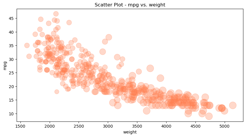 df.plot(kind = 'scatter', x='weight', y='mpg', c ='coral', s=cylineder_size, figsize = (10, 5), alpha = 0.3)
