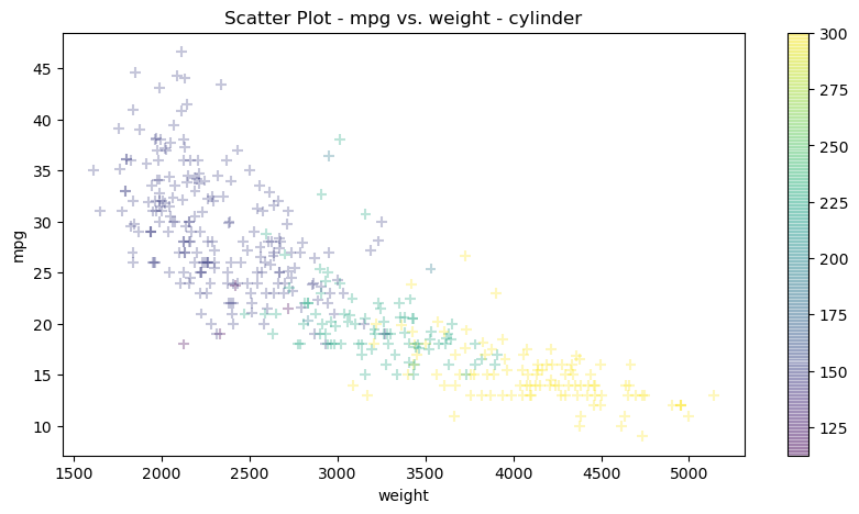 plt.title('Scatter Plot - mpg vs. weight - cylinder')