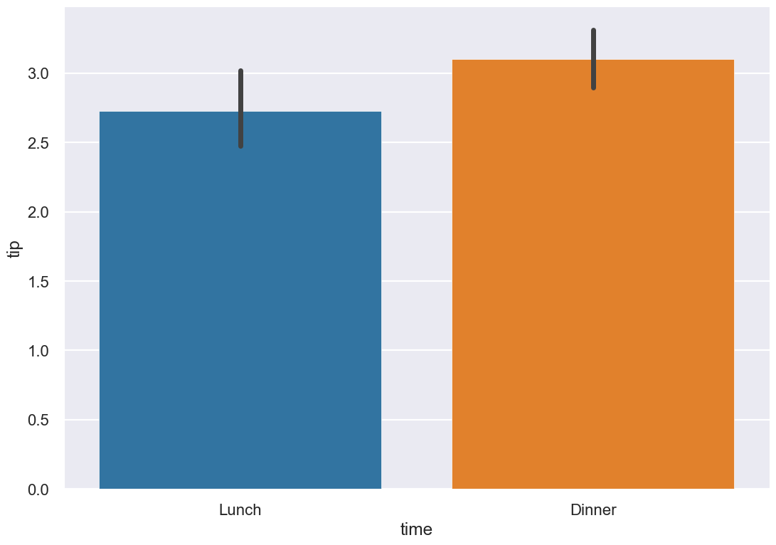 sns.barplot(x='time', y='tip', data=tips)
