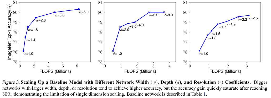 - ImageNet 데이터 세트 기준 80% 정확도에서 개별 scaling 요소를 증가시키더라도 성능향상이 어려움