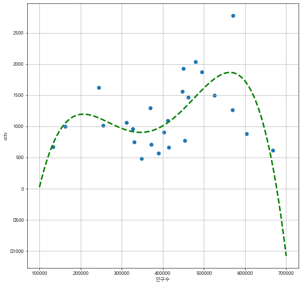 # 인구수와 소계 산점도, 회귀선 작성 # polyfit 최소제곱법을 이용한 상수값, 1 : 차수 fpl = np.polyfit(data_result['인구수'], data_result['소계'], 4) # ㅣ 직선 f1 = np.poly1d(fpl) # 인구수에 맞는 y값 fx = np.linspace(100000, 700000, 100) plt.figure(figsize = (10, 10)) plt.scatter(data_result['인구수'], data_result['소계'], s=50) plt.plot(fx, f1(fx), ls='dashed', lw=3, color='g') plt.xlabel('인구수') plt.ylabel('cctv') plt.grid() plt.show()