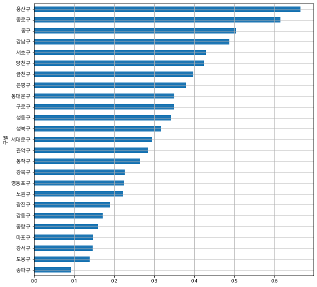 data_result['cctv비율'].sort_values().plot(kind='barh', grid = True, figsize = (10,10)) plt.show()
