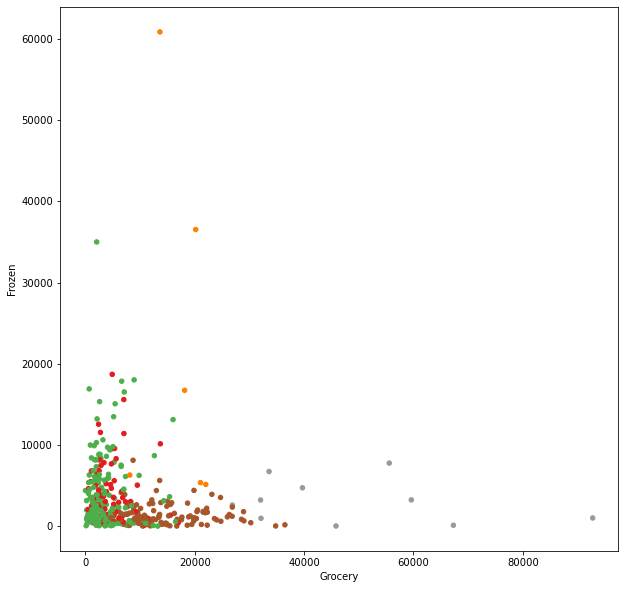 df.plot(kind = 'scatter', x ='Grocery', y = 'Frozen', c = 'Cluster', cmap = 'Set1', colorbar=False, figsize=(10,10))