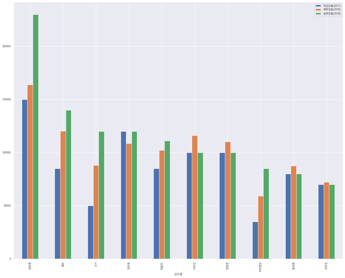 result_df.plot(x='선수명', y=['작년연봉(2017)','예측연봉(2018)','실제연봉(2018)'],kind = 'bar')