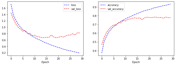 1094/1094 [==============================] - 18s 17ms/step - loss: 0.7627 - accuracy: 0.7346 - val_loss: 0.8088 - val_accuracy: 0.7163