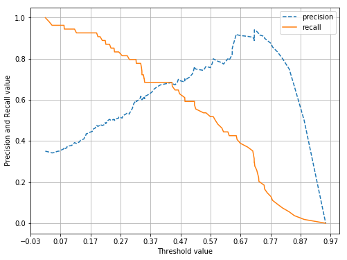 # threshold 값 X 축의 Scale을 0.1 단위로 변경