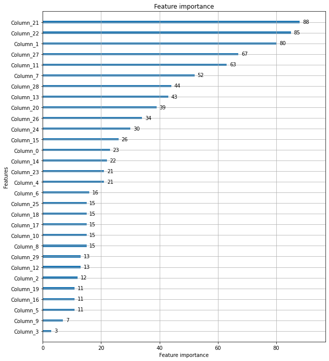 from lightgbm import plot_importance import matplotlib.pyplot as plt %matplotlib inline fig, ax = plt.subplots(figsize=(10, 12)) # 사이킷런 래퍼 클래스를 입력해도 무방. plot_importance(lgbm_wrapper, ax=ax)