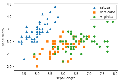#setosa는 세모, versicolor는 네모, virginica는 동그라미로 표현
