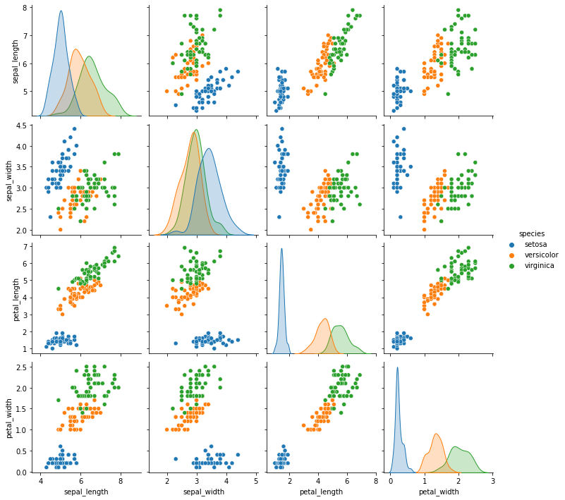 sns.pairplot(iris, hue='species', diag_kind='kde')
