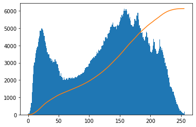 cdf_norm = cdf*float(hist.max()) / cdf.max() # 정규화, 0과 1사이의 값으로 만든다