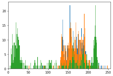 cv2.calcHist([im], [0], mask, [256], [0,256]) # mask외 분포 구할 때