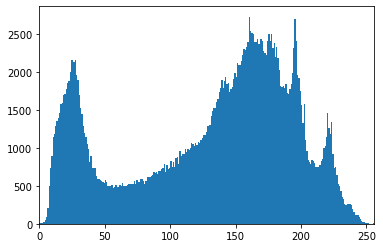 plt.hist(im.ravel(), 256, [0, 256]); # 내부적으로 bincount를 사용해서 연산한다