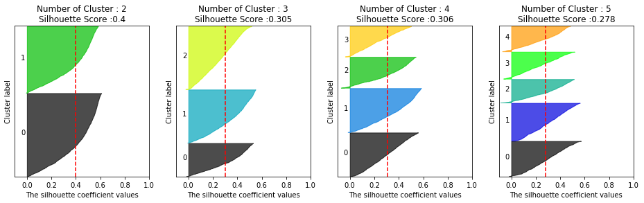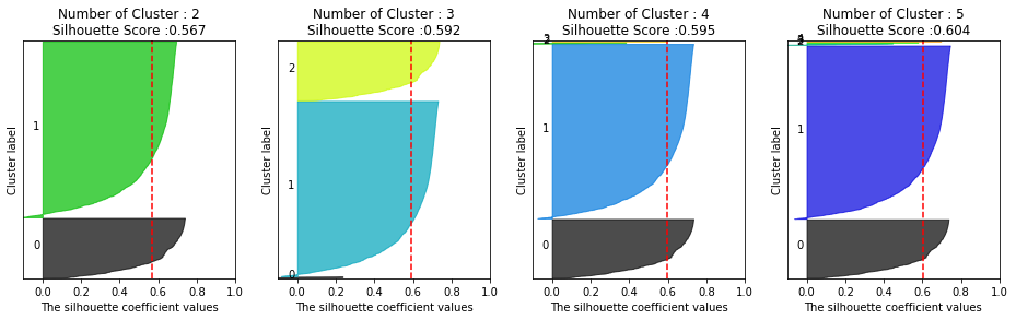 visualize_silhouette([2,3,4,5],X_features_scaled)