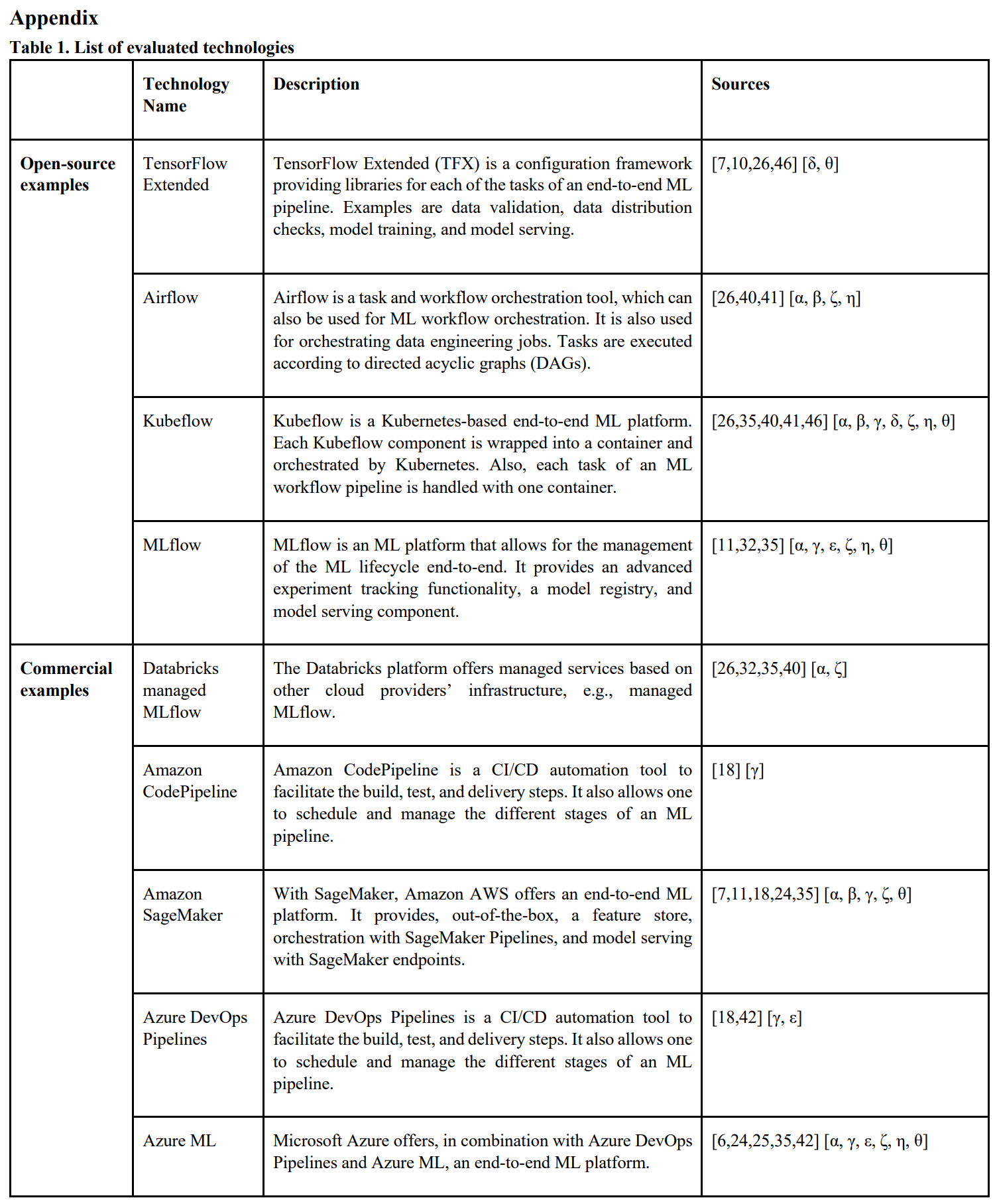 After going through 27 articles and eight interviews, various open-source tools, frameworks, and commercial cloud ML services were identified. These tools, frameworks, and ML services were reviewed to gain an understanding of the technical components of which they consist. An overview of the identified tools is depicted in Table 1 of the Appendix.