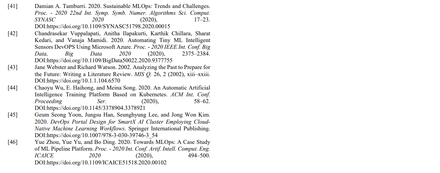 To ensure that our results are based on scientific knowledge, we conduct a systematic literature review according to the method of Webster and Watson [43] and Kitchenham et al. [20]. After an initial exploratory search, we define our search query as follows: ((("DevOps" OR "CICD" OR "Continuous Integration" OR "Continuous Delivery" OR "Continuous Deployment") AND "Machine Learning") OR "MLOps" OR "CD4ML"). We query the scientific databases of Google Scholar, Web of Science, Science Direct, Scopus, and the Association for Information Systems eLibrary. It should be mentioned that the use of DevOps for ML, MLOps, and continuous practices in combination with ML is a relatively new field in academic literature. Thus, only a few peer[1]reviewed studies are available at the time of this research. Nevertheless, to gain experience in this area, the search included non-peer-reviewed literature as well. The search was performed in May 2021 and resulted in 1,864 retrieved articles. Of those, we screened 194 papers in detail. From that group, 27 articles were selected based on our inclusion and exclusion criteria (e.g., the term MLOps or DevOps and CI/CD in combination with ML was described in detail, the article was written in English, etc.). All 27 of these articles were peer-reviewed.