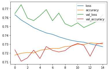 1313/1313 [==============================] - 5s 4ms/step - loss: 0.7272 - accuracy: 0.7303 - val_loss: 0.7629 - val_accuracy: 0.7312