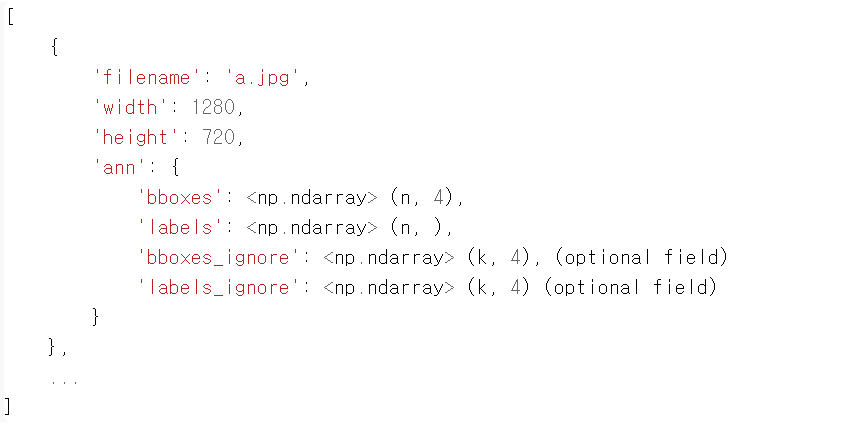 - ann_file로 입력되는 메타 파일을 읽어서 개별 image정보와 ann 정보를 dict로 생성하여 data_infos list에 입력