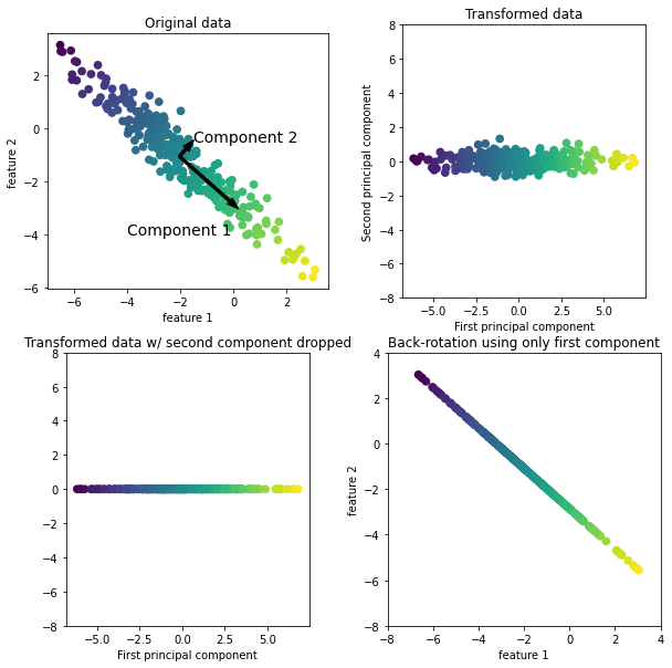 mglearn.plot_pca.plot_pca_illustration() # 차원이 축소 되어도 의미를 잃지 않았다 / 고차원의 특성이 저차원에서도 유지가 되었다 / manifold