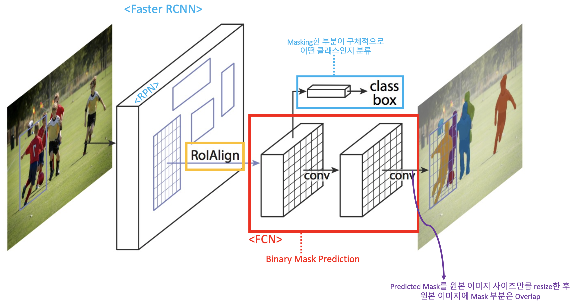* 기존 bounding box regression과 classification에 binary mask prediction 추가