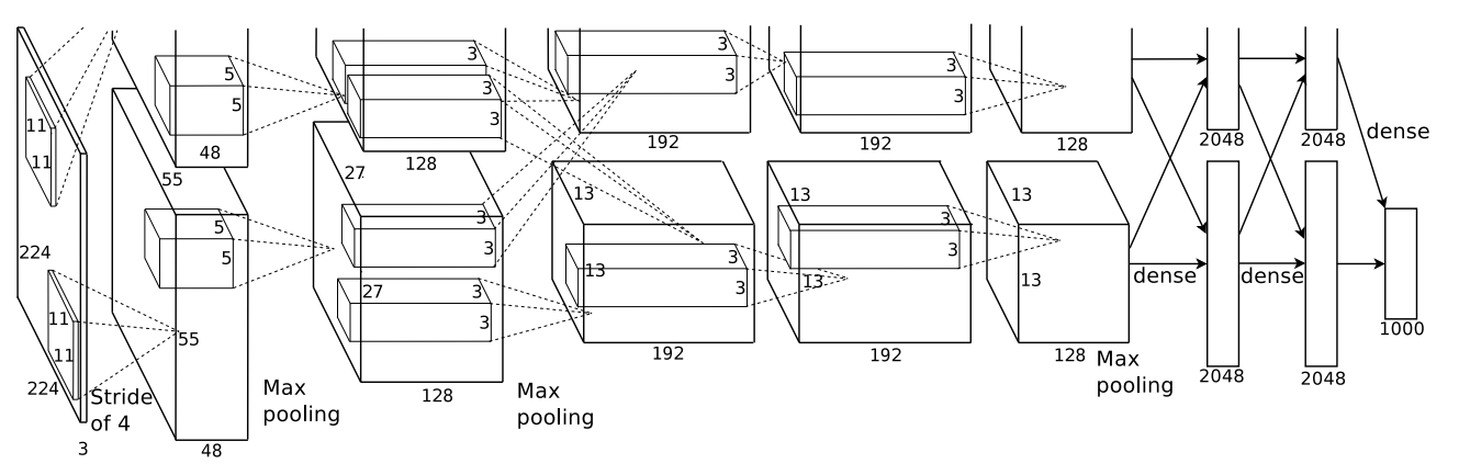 하드웨어 메모리가 부족하여 GPU 병렬 연산을 위해 CNN 구조를 절반으로 나누어 설계되었다