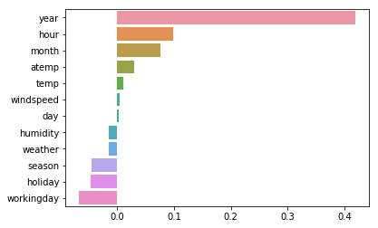 sns.barplot(x=coef_sort.values , y=coef_sort.index)