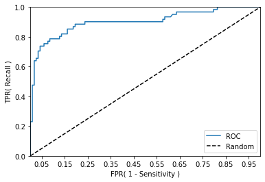 get_clf_eval(y_test, preds, pred_proba) 오차 행렬 [[33 4] [ 1 76]] 정확도: 0.9561, 정밀도: 0.9500, 재현율: 0.9870, F1: 0.9682, AUC:0.9905